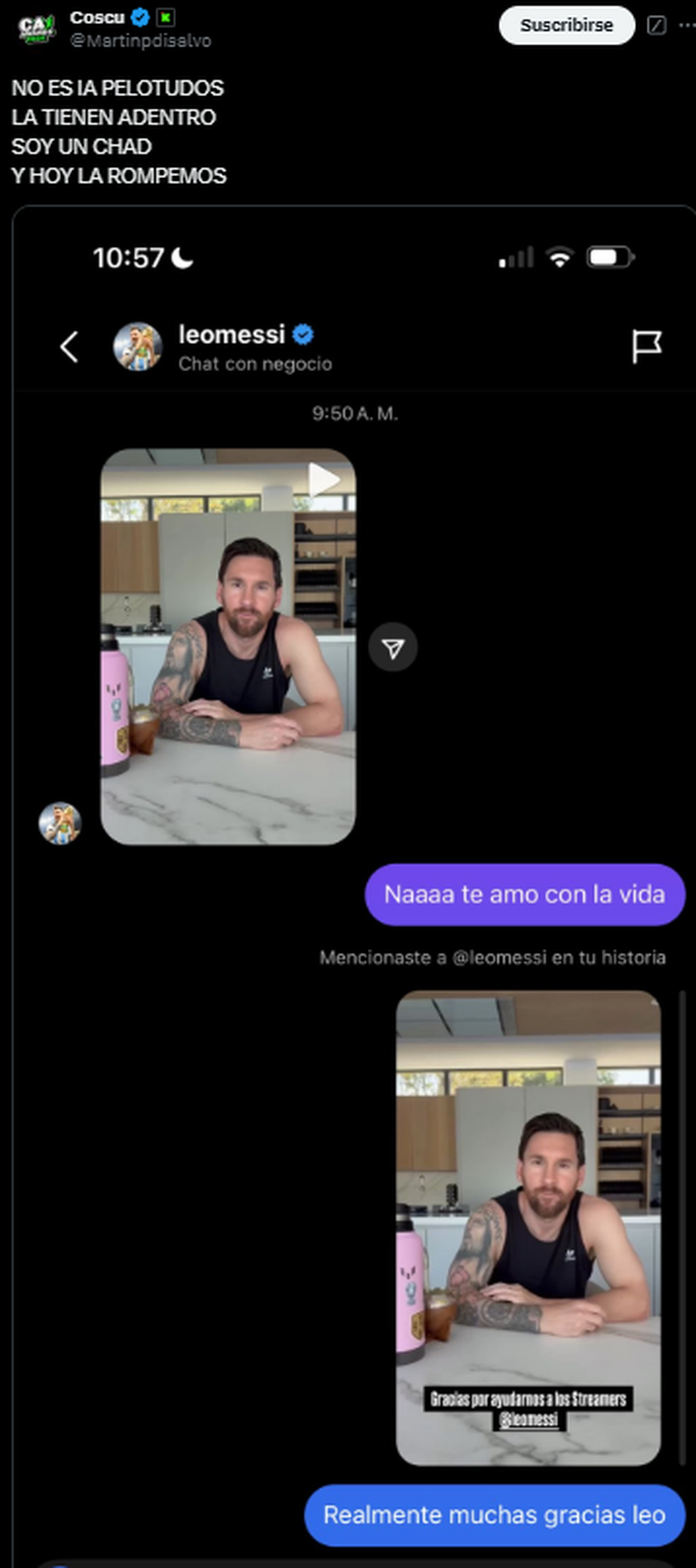 Primero publicó el video de Messi con el pie: "ES HOY Y EL 10 LO SABE" y luego ante la duda de si es IA, aseguró de manera ferviente: "NO ES IA PELOTUDOS. LA TIENEN ADENTRO. SOYUN CHAD. Y HOY LA ROMPEMOS"