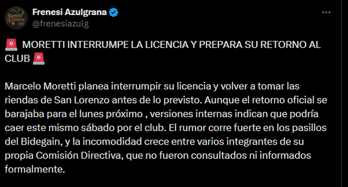 Todo indica que podrían avecinarse días de definición en la política Azulgrana y un posible regreso de la licencia de Moretti, podría ser fuerte en el seno del Ciclón.