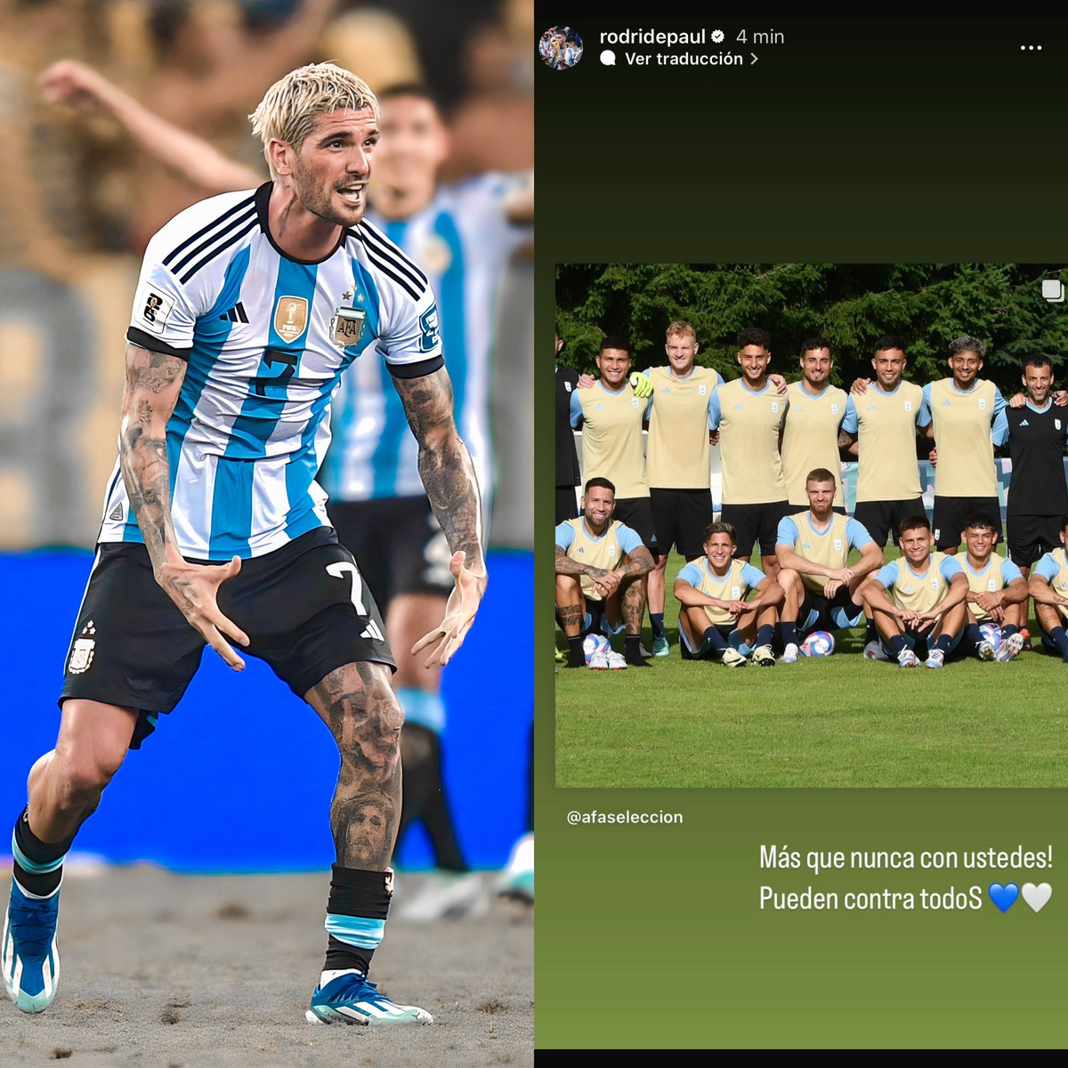 Lionel Messi es el capitán indiscutido en el último tiempo de la Selección Argentina. Pero si hay un jugador que viene haciendo méritos para ser el "capitán sin cinta" es Rodrigo De Paul. El "motorcito" (según Dibu Martínez) también habló a lo sucedido en Francia pero con un tono de aliento hacia la sub 23. "Más que nunca con ustedes, pueden contra todos". Publicó en una historia de IG