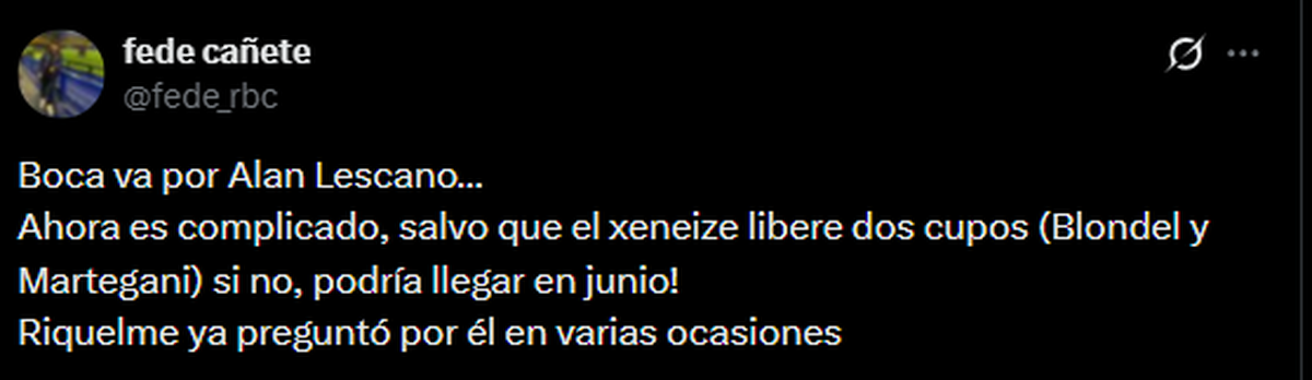 El periodista Federico Cañete aseguró: “Boca va por Alan Lescano… Ahora es complicado, salvo que el Xeneize libere dos cupos (Blondel y Martegani). Si no, podría llegar en junio. Riquelme ya preguntó por él en varias ocasiones”.