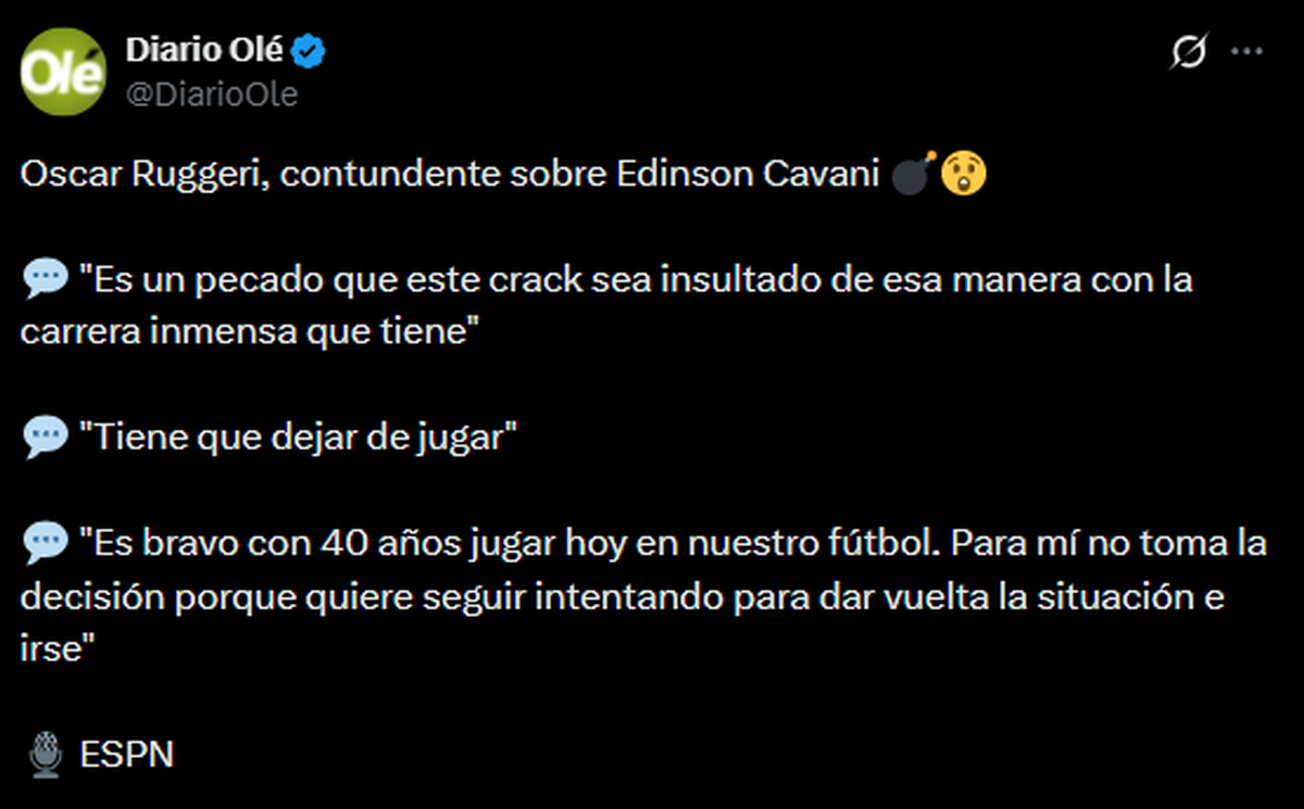 Por su parte, Oscar Ruggeri fue más mesurado en las formas, aunque dejó una frase contundente: “Es un pecado que este crack sea insultado de esa manera con la carrera inmensa que tiene. Tiene que dejar de jugar. Es bravo, con 40 años, jugar hoy en nuestro fútbol. Para mí no toma la decisión porque quiere seguir intentando dar vuelta la situación e irse”.