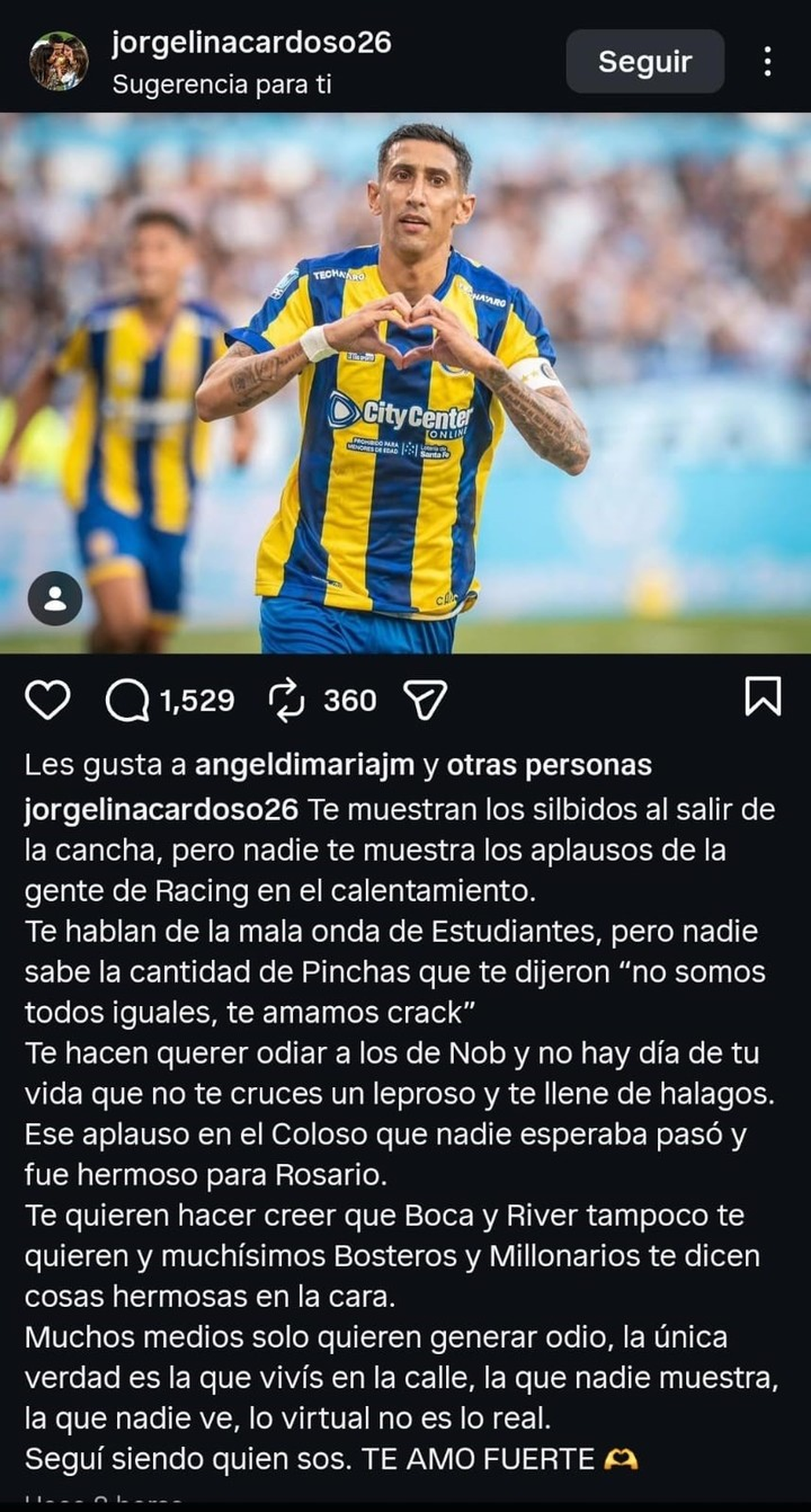 Luego agregó: “Te quieren hacer creer que Boca y River tampoco te quieren y muchísimos bosteros y millonarios te dicen cosas hermosas en la cara. Muchos medios solo quieren generar odio, la única verdad es la que vivís en la calle, la que nadie muestra, la que nadie ve. Lo virtual no es lo real. Seguí siendo quien sos. Te amo fuerte”, expresó la esposa de Di María en su cuenta de Instagram.
