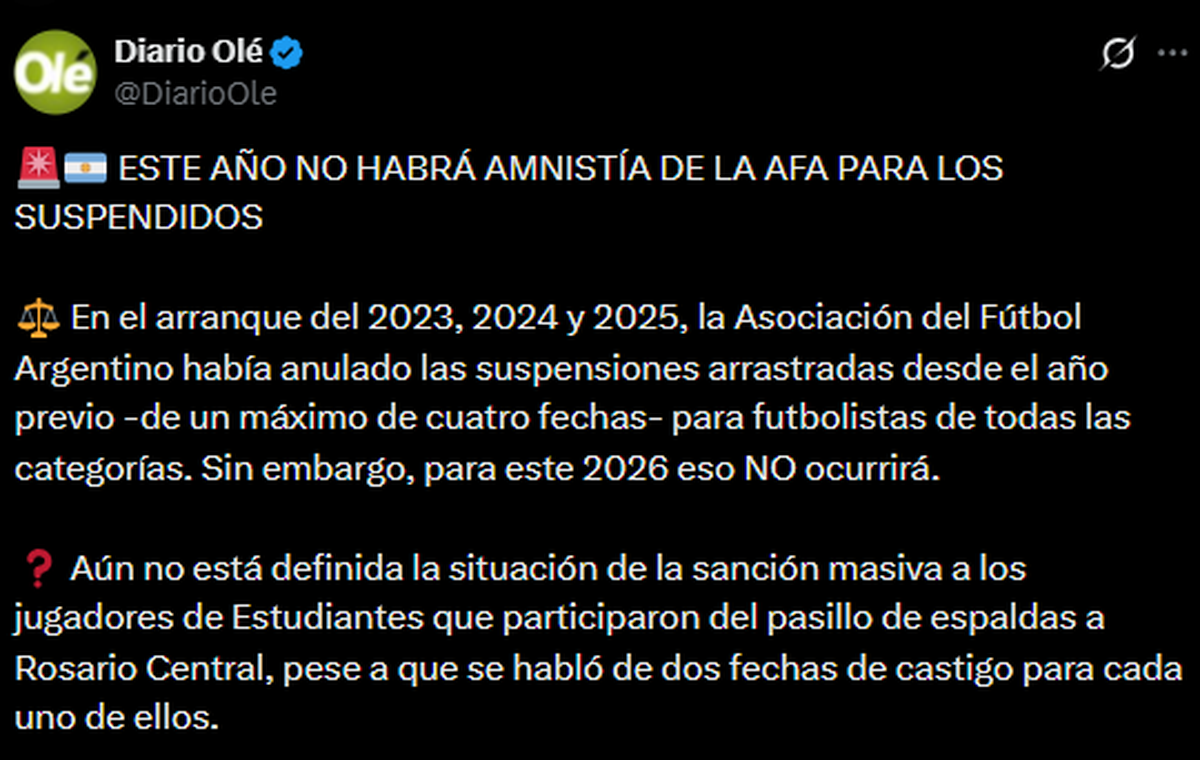 El medio deportivo aseguró: “Este año no habrá amnistía para los suspendidos”. Luego agregó: “Aún no está definida la situación de la sanción masiva a los jugadores de Estudiantes que participaron del pasillo de espaldas a Rosario Central, pese a que se habló de dos fechas de castigo para cada uno de ellos”.