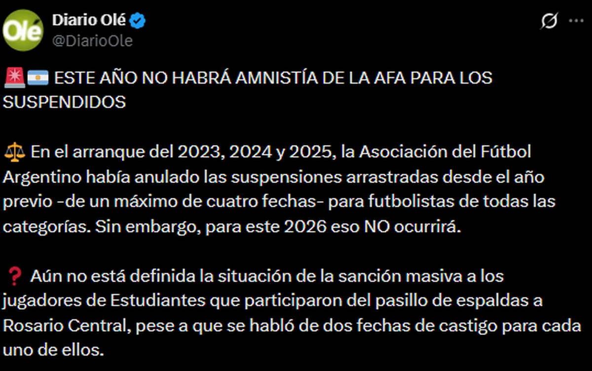 Sin embargo, Diario Olé fue contundente y aseguró: “Este año no habrá amnistía para los suspendidos”. Además, el medio agregó: “Aún no está definida la situación de la sanción masiva a los jugadores de Estudiantes que participaron del pasillo de espaldas a Rosario Central, pese a que se habló de dos fechas de castigo para cada uno de ellos”.
