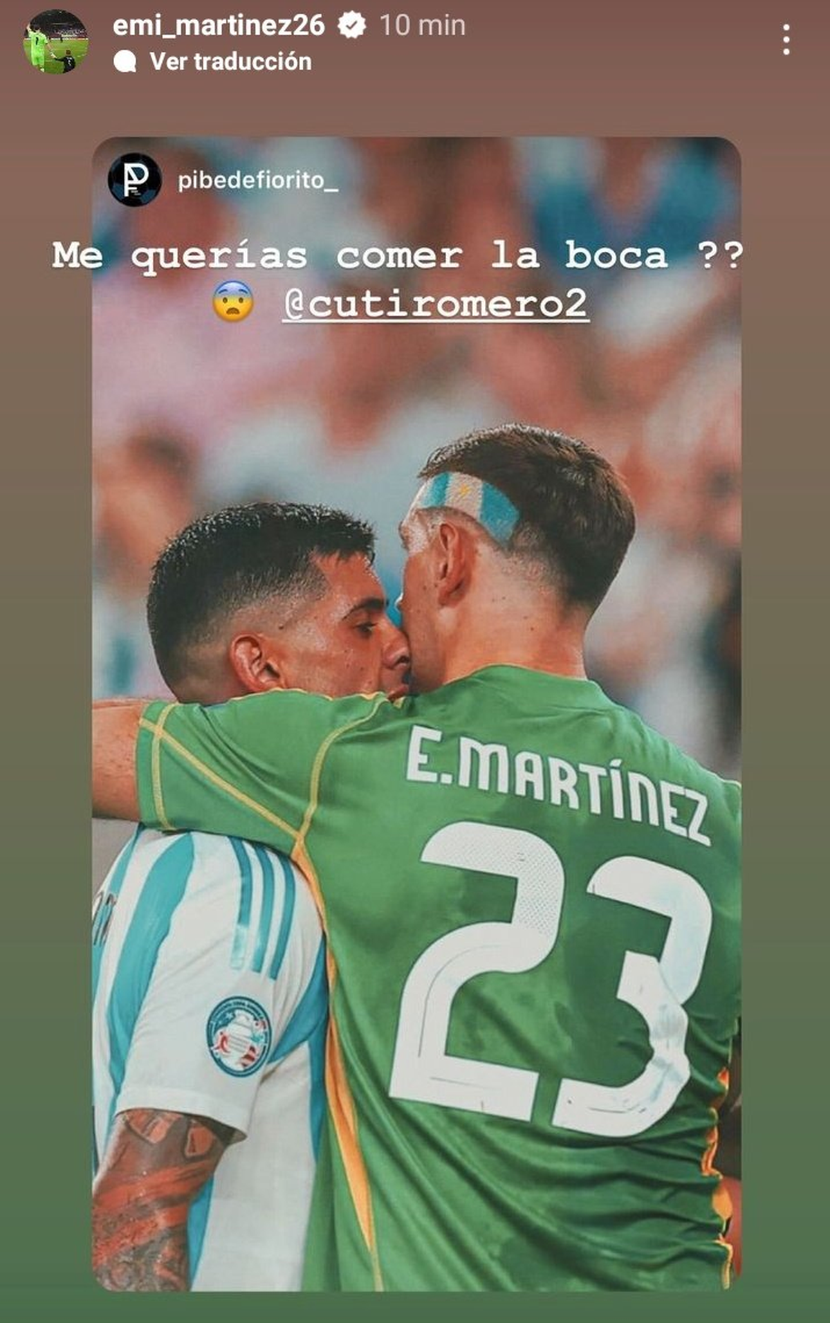 Una vez que terminó el partido, el arquero de la Selección subió una historia a su Instagram personal con el pie: "me querías comer la boca?" y acto seguido etiquetó al Cuti Romero