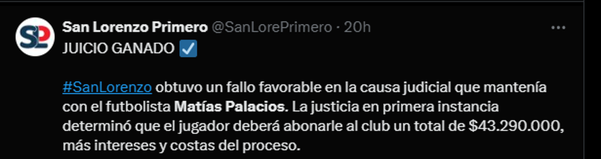 En las últimas horas, se conoció también que el Ciclón ganó un juicio a Matías Palacios a raíz del incumplimiento de un acuerdo firmado en 2021 por su salida del Ciclón hacia el FC Basel suizo.