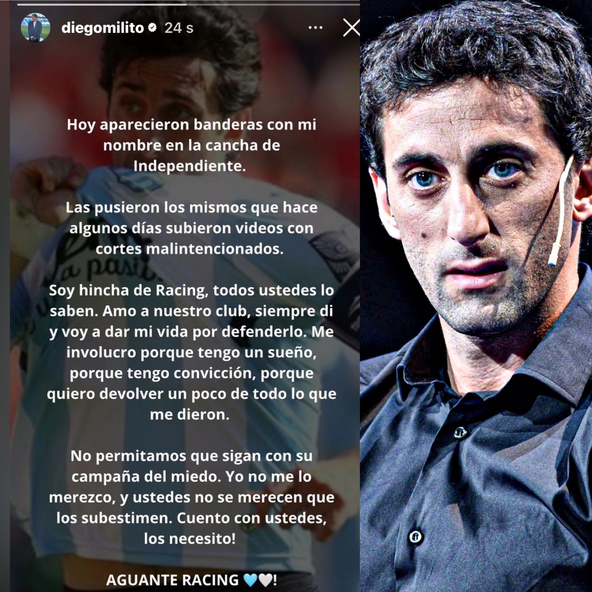 Diego Milito respondió a estas banderas mediante una historia de Instagram y de alguna manera u otra, le adjudicó al oficialismo de Racing estas banderas en la cancha del Rojo: