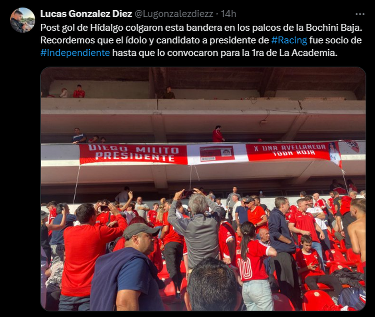Racing Club, flamante campeón de la Copa Sudamericana y con el afán de la Liga Profesional, está en pleno proceso electoral. Aparecieron banderas que hablan sobre Diego Milito en la cancha de Independiente a menos de 15 días de las elecciones.