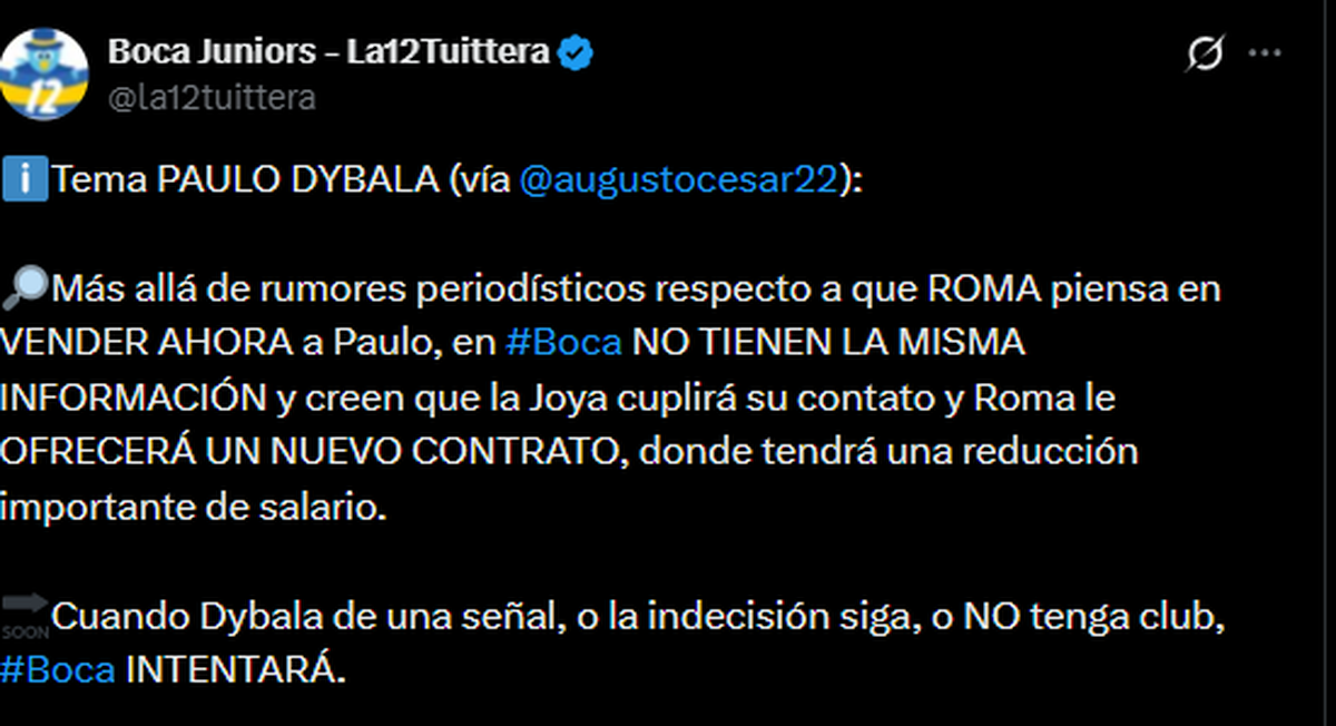 “Él sabe que su vínculo con la Roma termina en junio y que, si el club le ofrece renovar, será con un contrato inferior al actual. Del otro lado está Boca, que percibe que Dybala va a cumplir su vínculo y que la Roma intentará renovarlo. Boca va a actuar cuando vea un guiño del jugador”.