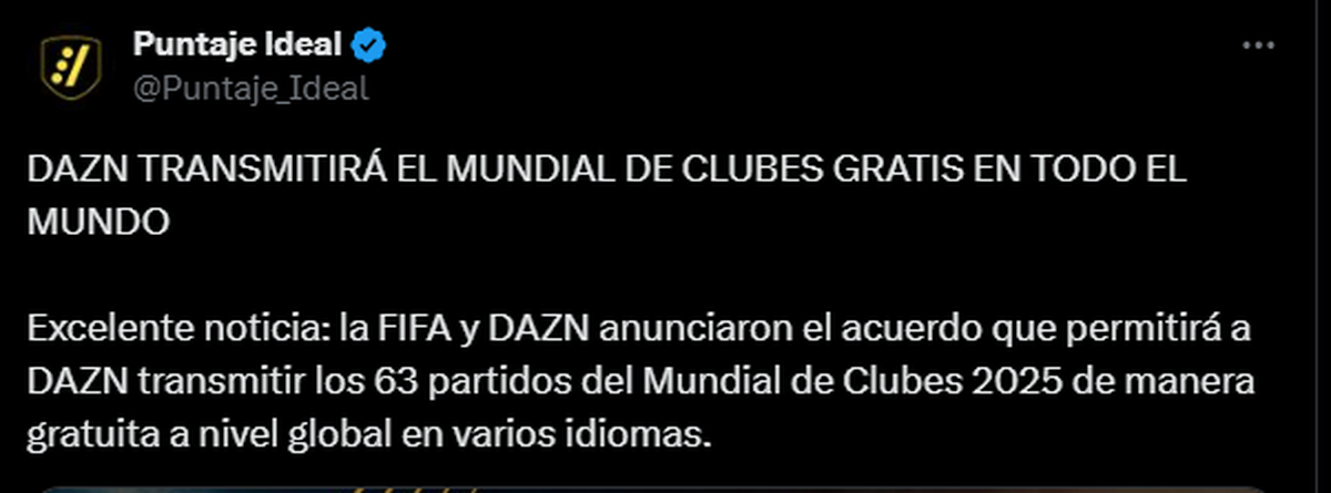 La plataforma de streaming del deporte DAZN confirmó que emitirá de forma gratuita y exclusiva el Mundial de Clubes en 2025. Contará con los 63 partidos de toda la competencia y podrá verse en distinos idiomas.
