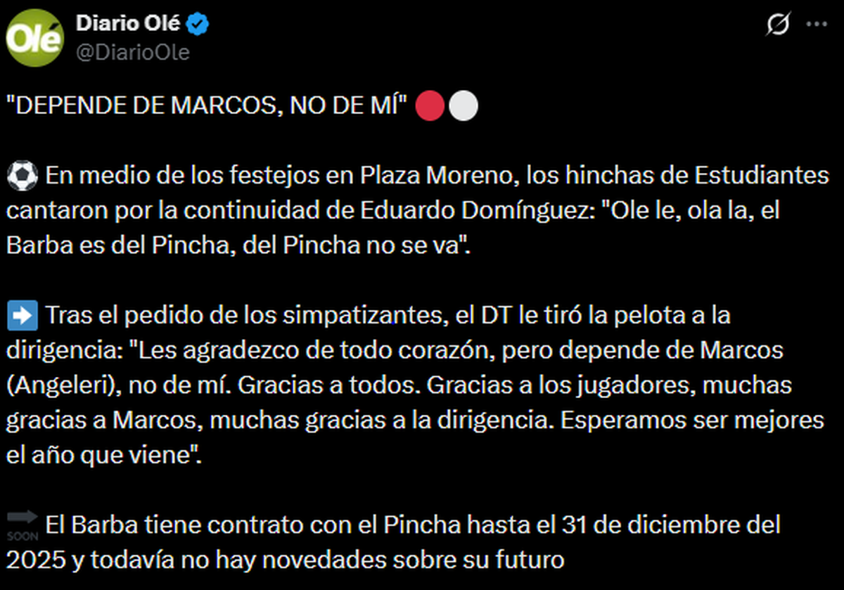 Estudiantes de La Plata se consagró campeón del Trofeo de Campeones tras derrotar a Platense, y uno de los momentos más esperados fue el testimonio de su entrenador, Eduardo Domínguez. En Boca Juniors, donde aún no está confirmada la continuidad de Claudio Úbeda, siguen con atención lo que pueda suceder con el Barba.