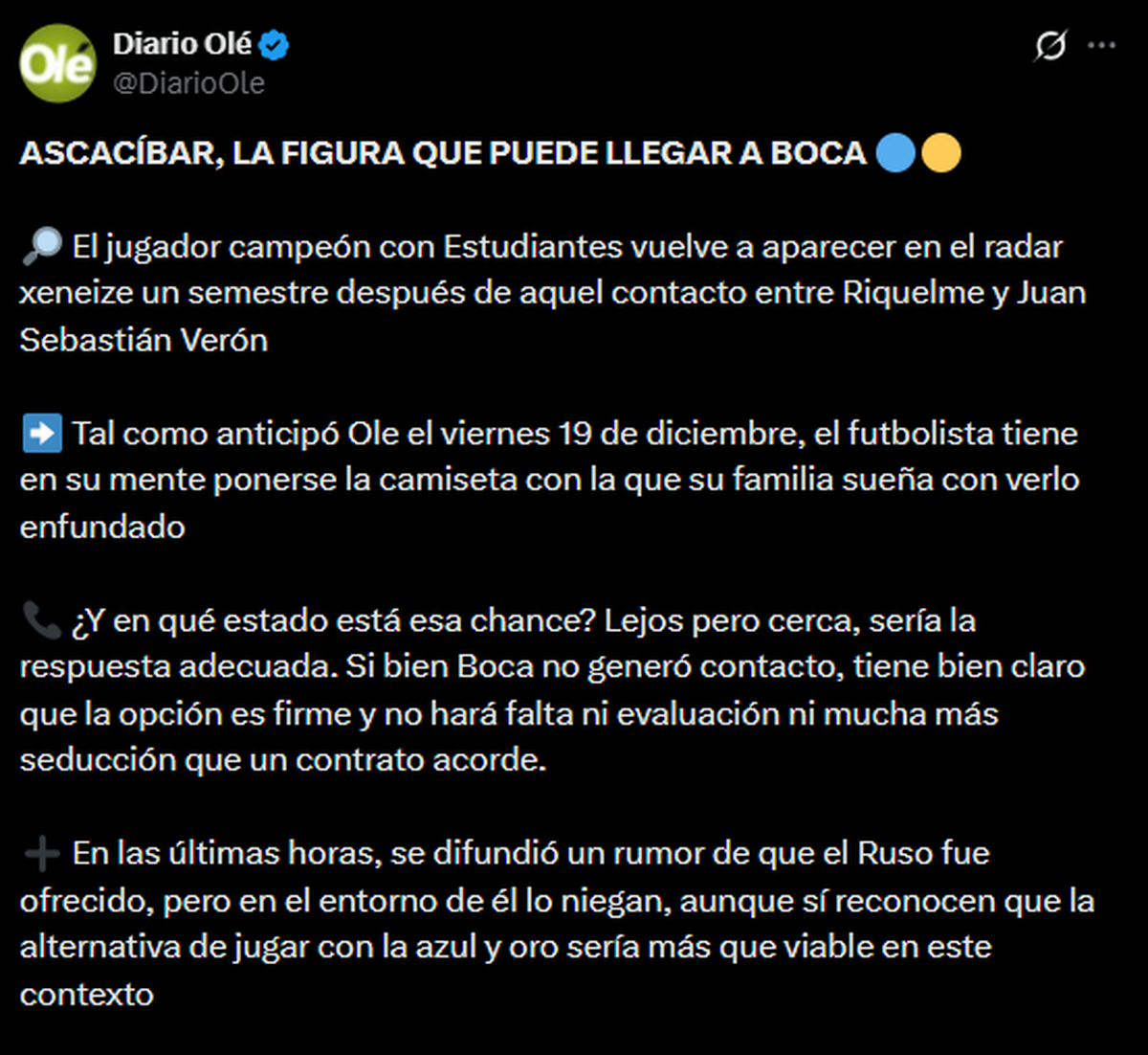 Por su parte, Diario Olé realizó dos afirmaciones importantes. En primer lugar, señaló que “el futbolista tiene en su mente ponerse la camiseta con la que su familia sueña con verlo enfundado”. Además, agregó: “Si bien Boca no generó contacto, tiene claro que la opción es firme y no hará falta ni evaluación ni demasiada seducción, más allá de un contrato acorde”.