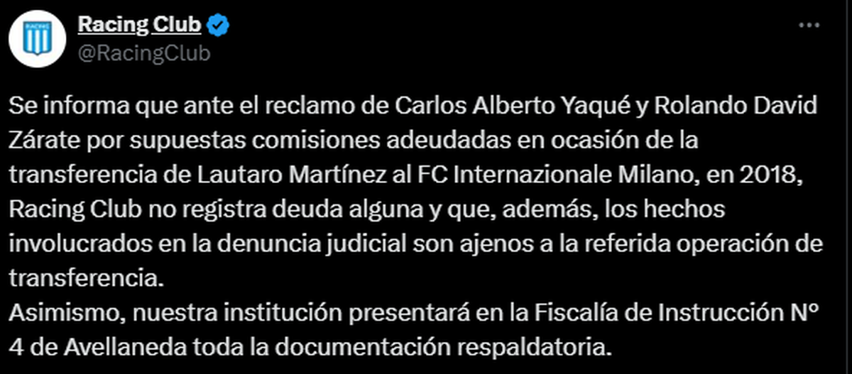 Se informa que ante el reclamo de Carlos Alberto Yaqué y Rolando David Zárate por supuestas comisiones adeudadas en ocasión de la transferencia de Lautaro Martínez al FC Internazionale Milano, en 2018, Racing Club no registra deuda alguna y que, además, los hechos involucrados en la denuncia judicial son ajenos a la referida operación de transferencia. Asimismo, nuestra institución presentará en la Fiscalía de Instrucción N° 4 de Avellaneda toda la documentación respaldatoria.