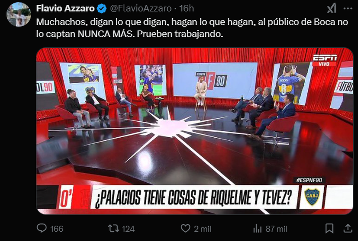 Entendiendo que justamente la idea era causar repercusión por nombrar a dos de los ídolos contemporáneos más importantes del club de la Ribera, Flavio Azzaro salió al cruce: "Muchachos, digan lo que digan, hagan lo que hagan, al público de Boca no lo captan NUNCA MÁS. Prueben trabajando.", posteó en su cuenta de X, acompañado de la foto del graph mencionado.