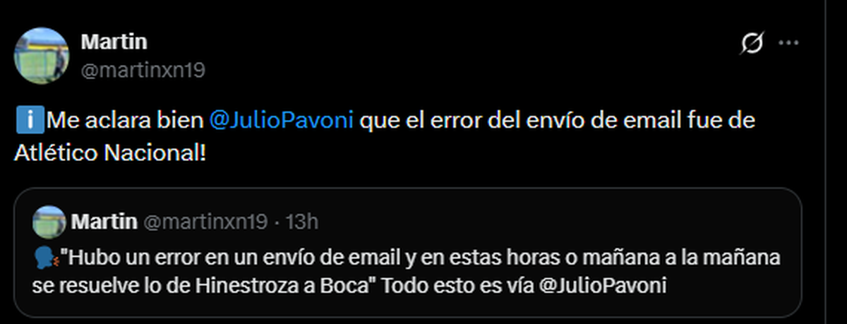 Minutos más tarde, el mismo comunicador aclaró: “Me aclara bien @JulioPavoni que el error del envío de email fue de Atlético Nacional”.