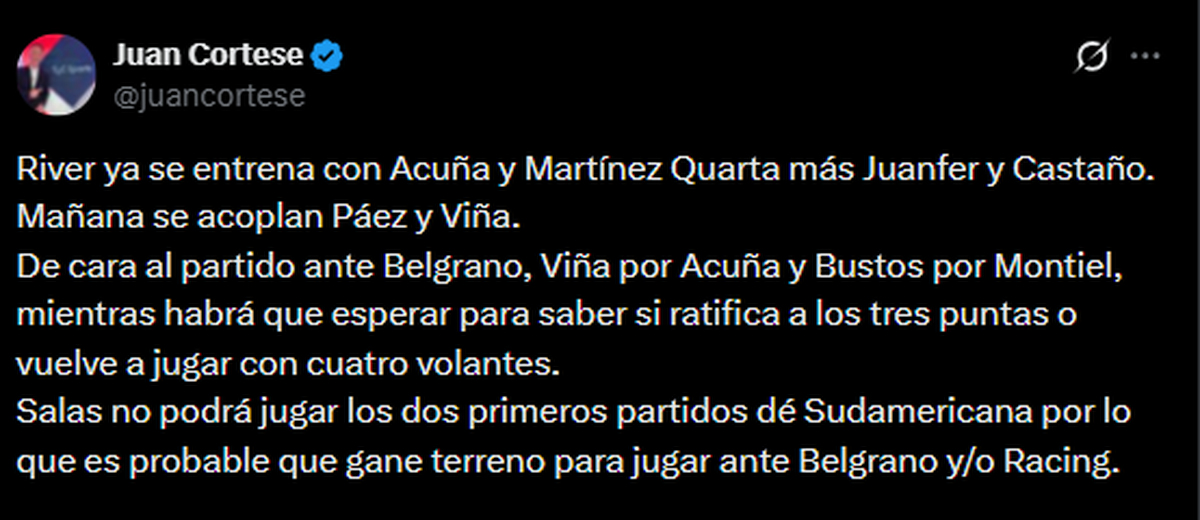 En River habrá impacto por lo que dijo Juan Cortese sobre Maximiliano Salas