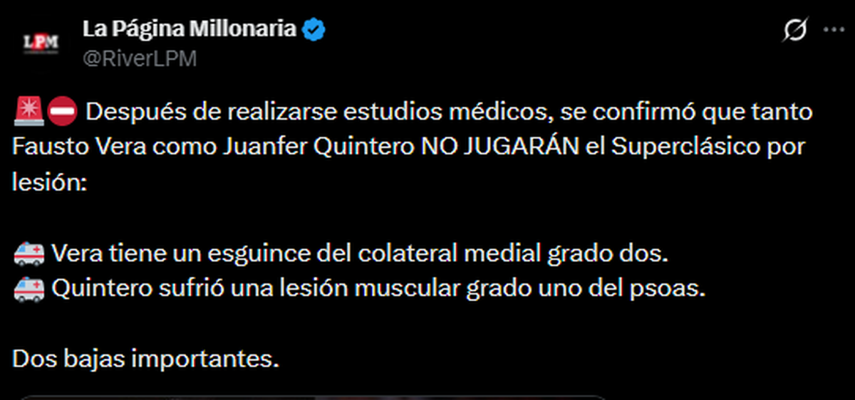 Sin embargo, a horas del encuentro, River dio a conocer la lista de convocados y el volante colombiano quedó fuera. Es decir, no solo no será titular, sino que ni siquiera estará disponible para sumar minutos.