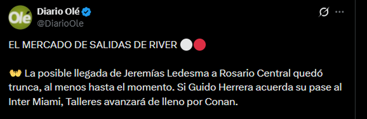 En ese sentido, Diario Olé reveló: “La posible llegada de Jeremías Ledesma a Rosario Central quedó trunca, al menos hasta el momento. Si Guido Herrera acuerda su pase al Inter Miami, Talleres avanzará de lleno por Conan”.