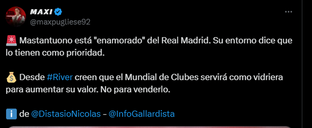 El conductor del ciclo Superfútbol de TyC Sports, Agustín Fantasía, hizo una aclaración pertinente al respecto: "acá contamos que el deseo de Mastantuono es rechazar ofertas y esperar a Real Madrid". Lo cual es cierto, fue el mismo García Grova quien dio esa información.