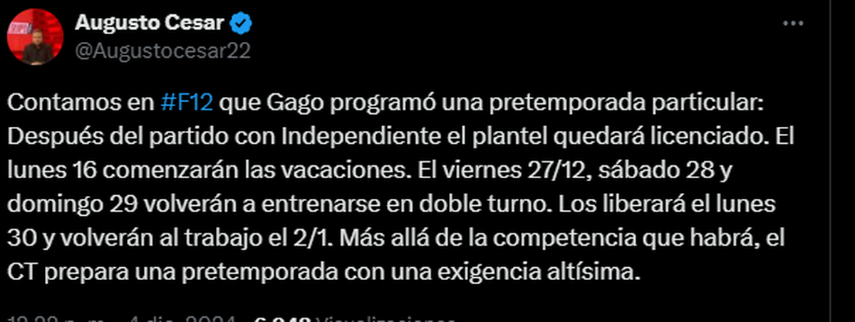 Luego, Augusto Cesar, otro periodista de ESPN, afirmó que la pretemporada comenzaría el 27 de diciembre.
