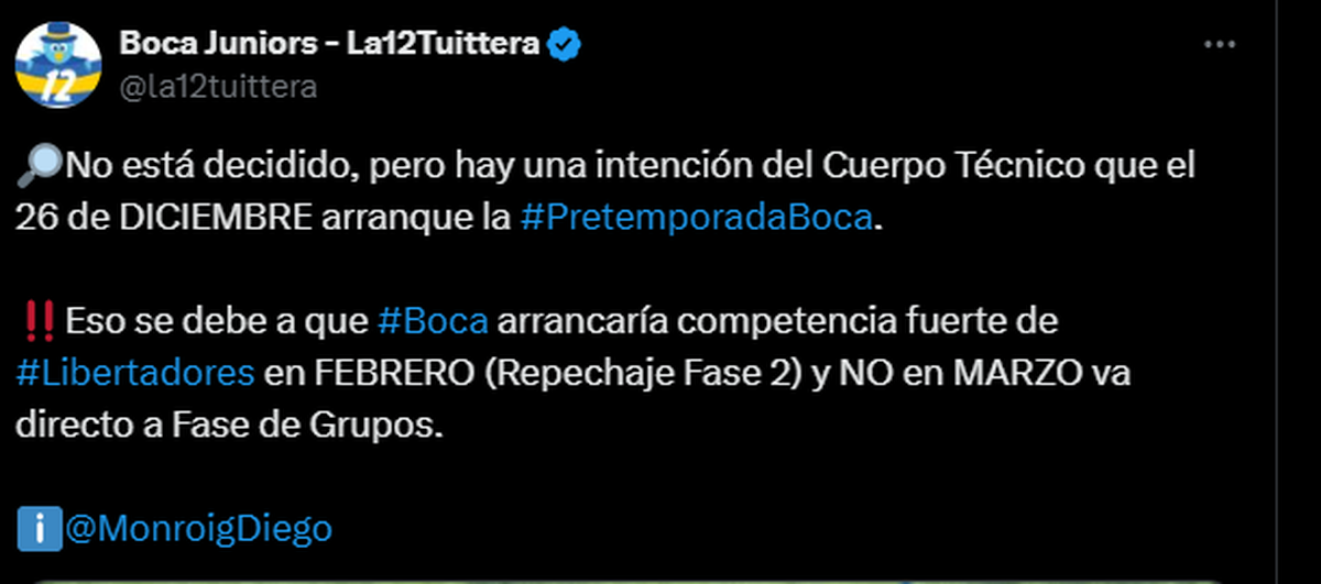 Lo que movería la aguja, en principio, es la posición en la que quede Boca una vez que finalice la Liga Profesional. Principalmente, poque según Monroig: "no es lo mismo iniciar en fase 2 (de Libertadores) que arranca en febrero, que arrancar en fase de grupos que comienza en abril".