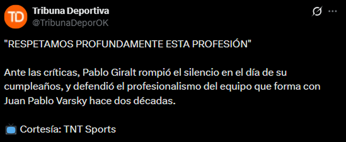 En respuesta a esta situación, durante la transmisión del partido entre River y Belgrano el pasado domingo (ya habiendo pasado algunas semanas), Pablo Giralt ofreció una réplica con un mensaje claro y conciliador: “Nosotros estamos muy felices de hacer este laburo. Hace más de 20 años que trabajamos juntos con Juan Pablo en un montón de circunstancias de nuestra vida, días felices y días no tan felices, y lo hacemos con mucha pasión y profesionalismo, dejando absolutamente todo, con una intachable honestidad intelectual”.