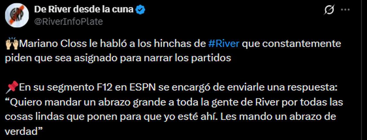 Hace algunos días, Mariano Closs encendió la mecha al postularse para relatar partidos de River Plate con un mensaje dirigido a los hinchas: “Quiero mandar un abrazo grande a toda la gente de River, al mundo River. Por todas las cosas lindas que ponen para que yo esté ahí. Les mando un abrazo de verdad”.