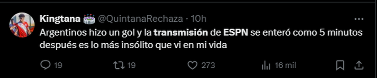 Luego de este insólito suceso, un usuario comentó: "Argentinos hizo un gol y la transmisión de ESPN se enteró como 5 minutos después es lo más insólito que vi en mi vida"
