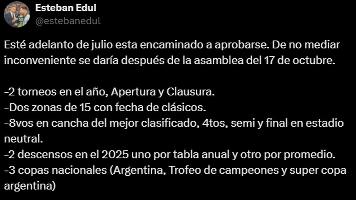 En julio de este año Edul (y Hugo Balassone) había adelantado cómo sería el nuevo formato del fútbol argentino. Este martes 15/10 volvió a ahondar en el tema y aseguró que: "el adelanto de julio esta encaminado a aprobarse" y "de no mediar inconveniente se daría después de la asamblea del 17 de octubre."