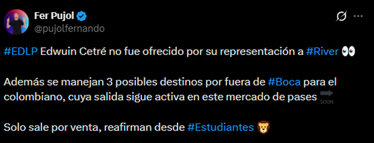 Luego agregó: “Además, se manejan tres posibles destinos por fuera de Boca para el colombiano, cuya salida sigue activa en este mercado de pases. Solo sale por venta, reafirman desde Estudiantes”.