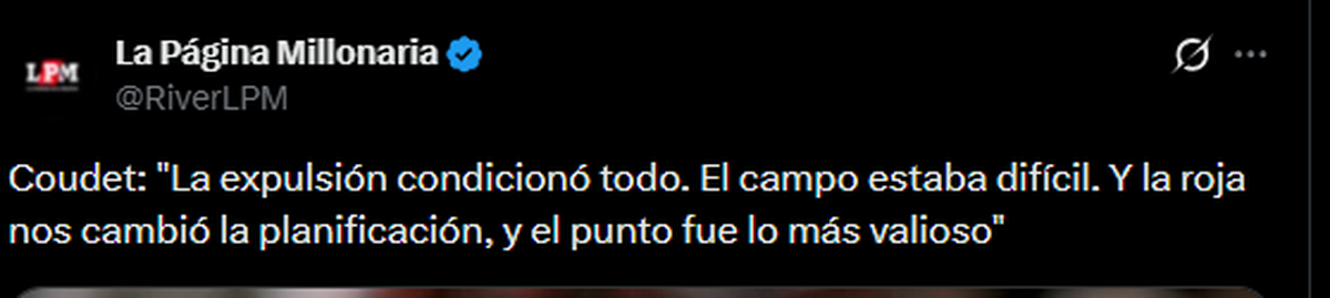 "Una expulsión tan temprana cambia absolutamente todo. Hay que reacomodarse en un partido y en un campo de juego difíciles. Nos llevamos el punto como lo más valioso de la noche", afirmó Chacho Coudet tras el empate 1 a 1 de River Plate frente a Blooming en Bolivia.