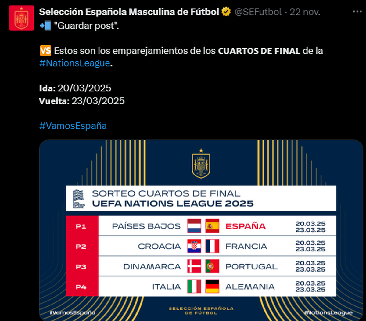En principio, la primera fecha (marzo), está dada para que España juegue ante Países Bajos por los cuartos de la Nations League (a ida y vuelta). Podría haber una ingeniería, para que la Finalissima se juegue en la fecha de junio.