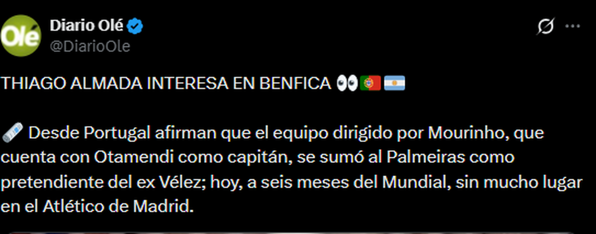 Palmeiras, el otro equipo que ha tenido grandes rendimientos en los últimos tiempos, busca incorporar a Thiago Almada, aunque la llegada del ex Vélez estaría próxima a ser a Benfica.