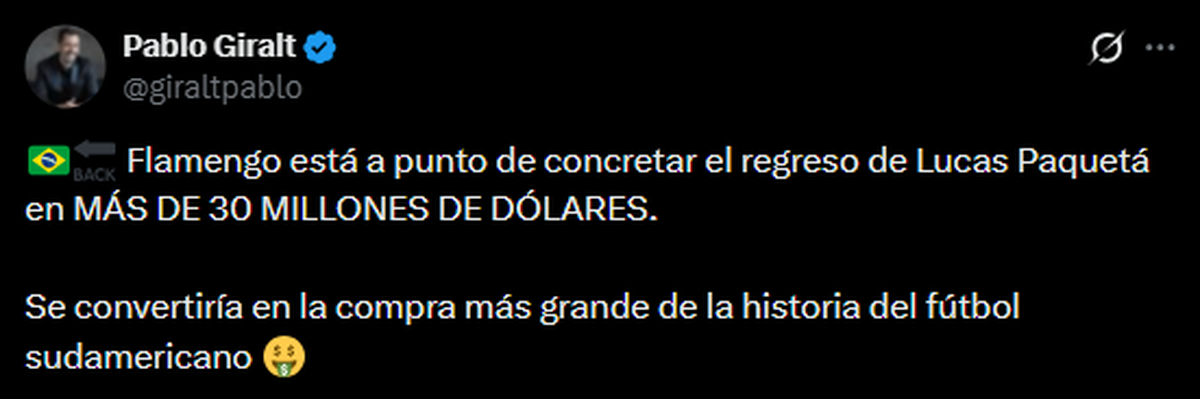 Según informó Pablo Giralt en su cuenta de X, la operación podría concretarse por una cifra superior a los 30 millones de dólares, lo que convertiría el pase en la compra más cara de la historia del fútbol sudamericano.
