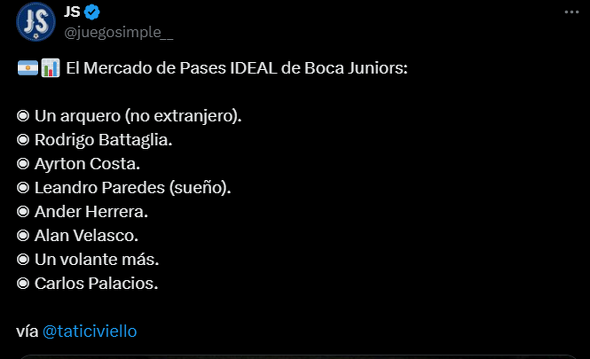 Boca está cerca de concretar, según Claudio Civiello, un "mercado de pases ideal". Ya llegaron Ayrton Costa y Carlos Palacios y según el periodista, los nombres que faltarían serían los siguientes para que sea, según el criterio de Román, un 10/10: