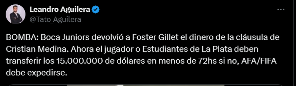 Tato Aguilera afirmó que "Boca Juniors devolvió a Foster Gillet el dinero de la cláusula de Cristian Medina. Ahora el jugador o Estudiantes de La Plata deben transferir los 15.000.000 de dólares en menos de 72hs si no, AFA/FIFA debe expedirse."