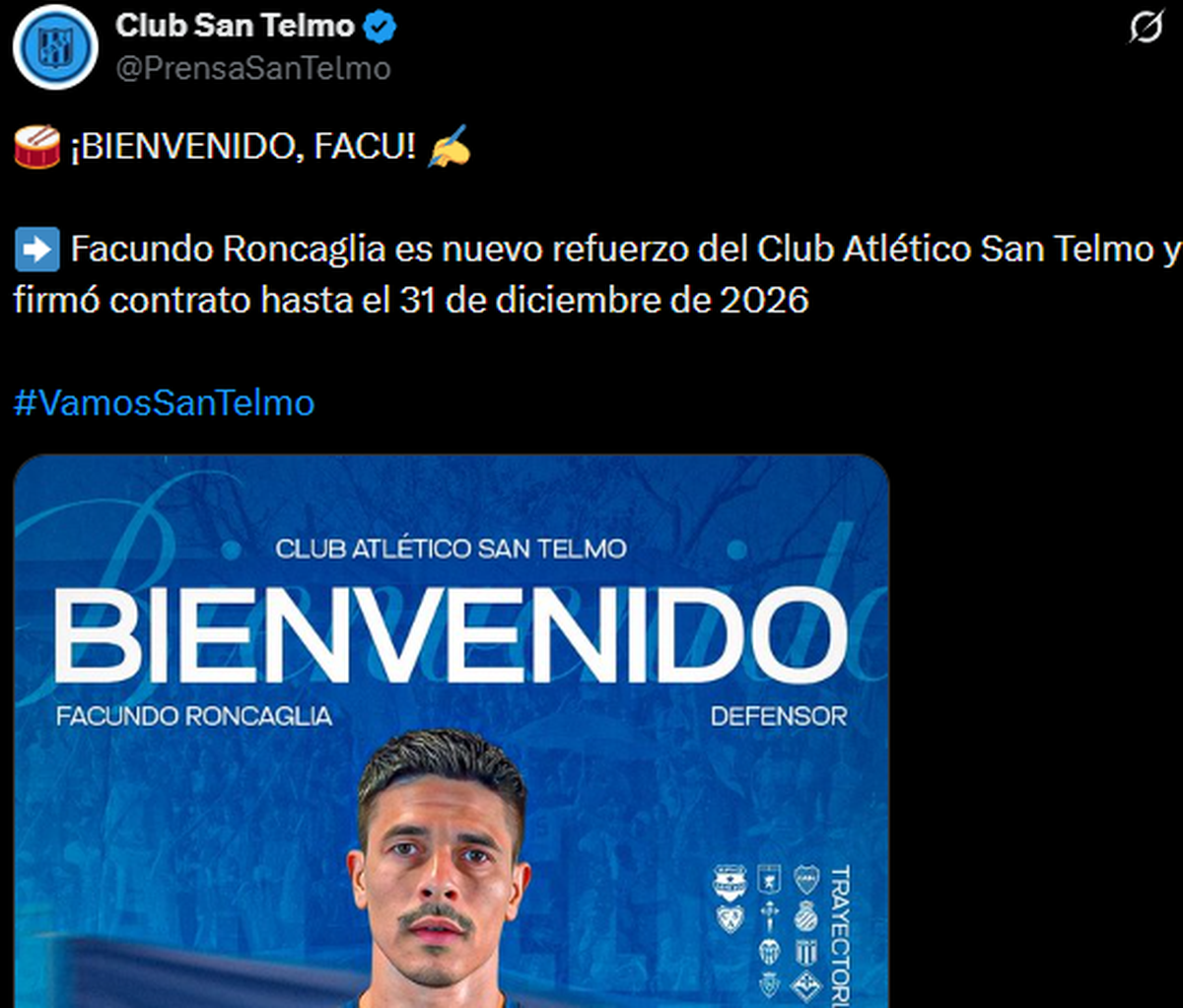 "¡BIENVENIDO, FACU! Facundo Roncaglia es nuevo refuerzo del Club Atlético San Telmo y firmó contrato hasta el 31 de diciembre de 2026", informó el club.