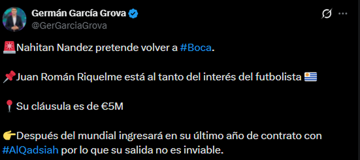 Según confirmó el especialista en mercado de pases Germán García Grova: “Nahitan Nández pretende volver a Boca. Juan Román Riquelme está al tanto del interés del futbolista uruguayo. Su cláusula es de 5 millones de euros y, tras el Mundial, ingresará en su último año de contrato con Al Qadsiah, por lo que su salida no es inviable”.