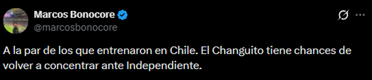 En esta sintonía, el periodista de TNT Sports, Marcos Bonocore, aseguró: “A la par de los que entrenaron en Chile. El Changuito tiene chances de volver a concentrar ante Independiente”.