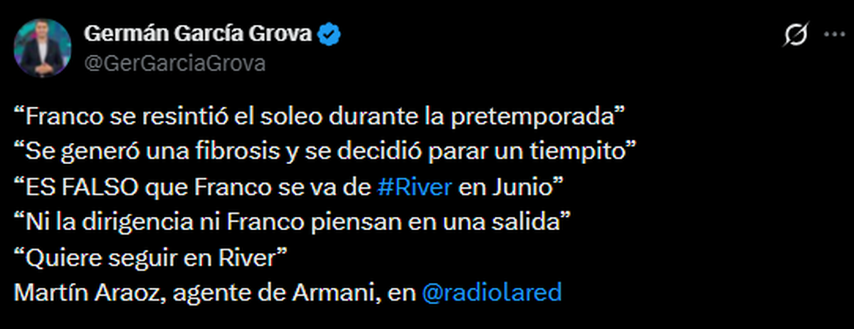En los últimos días, el periodista Sebastián Srur aseguró que Armani podría volver a estar disponible recién después del Mundial. De confirmarse este escenario, el arco del Millonario seguiría en manos del juvenil Santiago Beltrán durante gran parte del semestre.