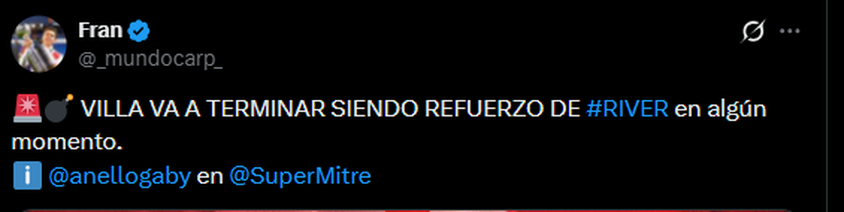 Si bien todo indica que el mensaje responde únicamente a la amistad que los une, Gabriel Anello fue más allá y aseguró: “Sebastián Villa va a terminar siendo refuerzo de River en algún momento”.