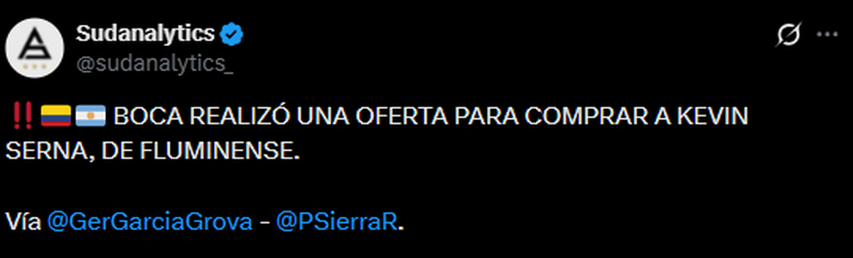 Según información compartida por Germán García Grova y el periodista colombiano Pipe Sierra, el club realizó una primera oferta por Kevin Serna para adquirir de manera definitiva al futbolista de Fluminense.