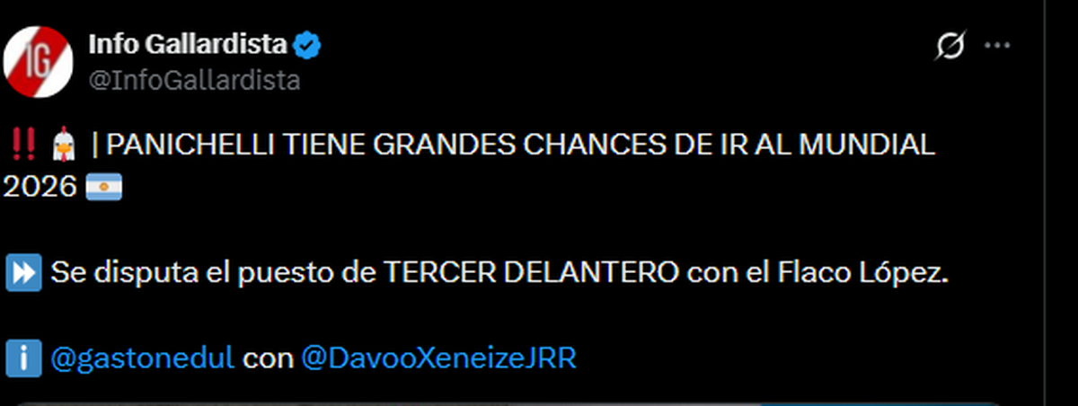 El periodista Gastón Edul aportó información al respecto y aseguró que Joaquín Panichelli cuenta con grandes posibilidades de integrar la lista. El atacante del Racing de Estrasburgo compite por ese lugar con Flaco López, actual delantero del Palmeiras.