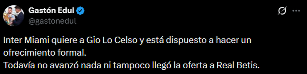 "Inter Miami quiere a Giovanni Lo Celso y está dispuesto a hacer un ofrecimiento formal. Todavía no avanzó nada ni tampoco llegó la oferta a Real Betis.", confirmó el menor de los hermanos acerca del ex volante de Rosario Central.