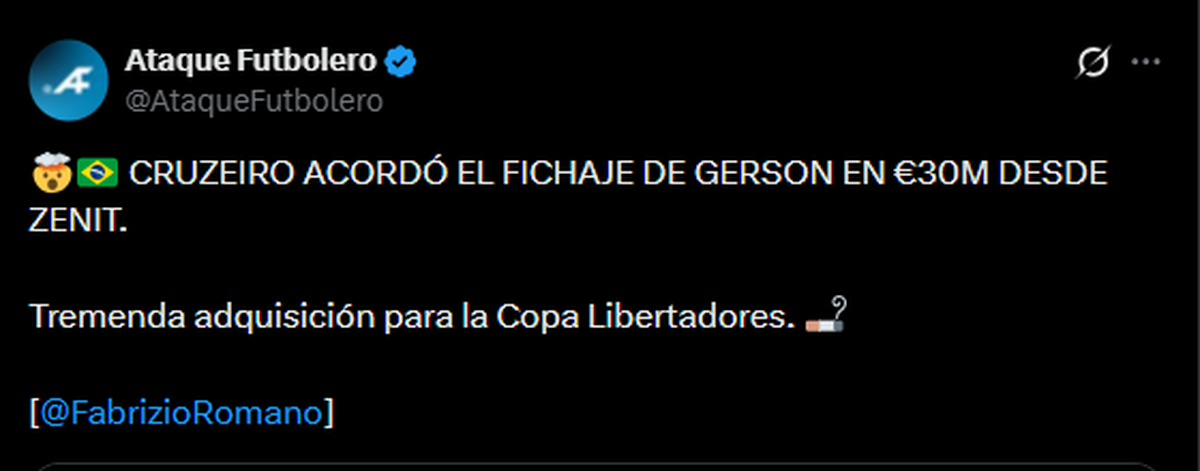 Cruzeiro, otro de los equipos que disputará la Copa Libertadores 2026, también rompió el mercado de pases tras llegar a un acuerdo con Gerson, procedente del Zenit de Rusia, por 26 millones de euros más cuatro millones en bonos. De esta manera, superó a Vitor Roque como el fichaje más caro en la historia del continente.