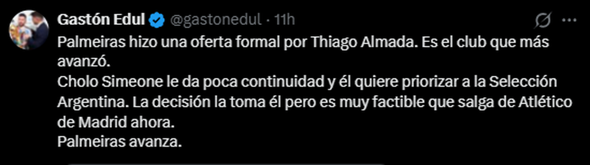 En ese contexto, el periodista Gastón Edul aseguró: “Palmeiras hizo una oferta formal por Thiago Almada. Es el club que más avanzó. Cholo Simeone le da poca continuidad y él quiere priorizar a la Selección Argentina. La decisión la toma él, pero es muy factible que salga de Atlético de Madrid ahora. Palmeiras avanza”.