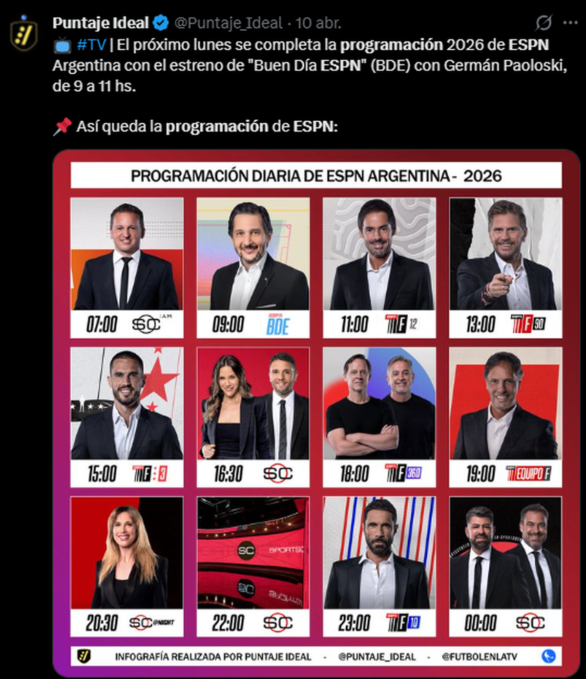 En ese contexto, ESPN ya contaba con una ventaja competitiva, ya que iniciaba su programación desde las 7:00, superando a su competidor por varias horas. Con la incorporación del nuevo programa “Buen Día ESPN”, conducido por Germán Paoloski, que se emite desde las 9:00, la señal busca ampliar aún más esa diferencia en la franja matutina. Resta por ver si esta estrategia logrará consolidar su liderazgo en términos de audiencia.