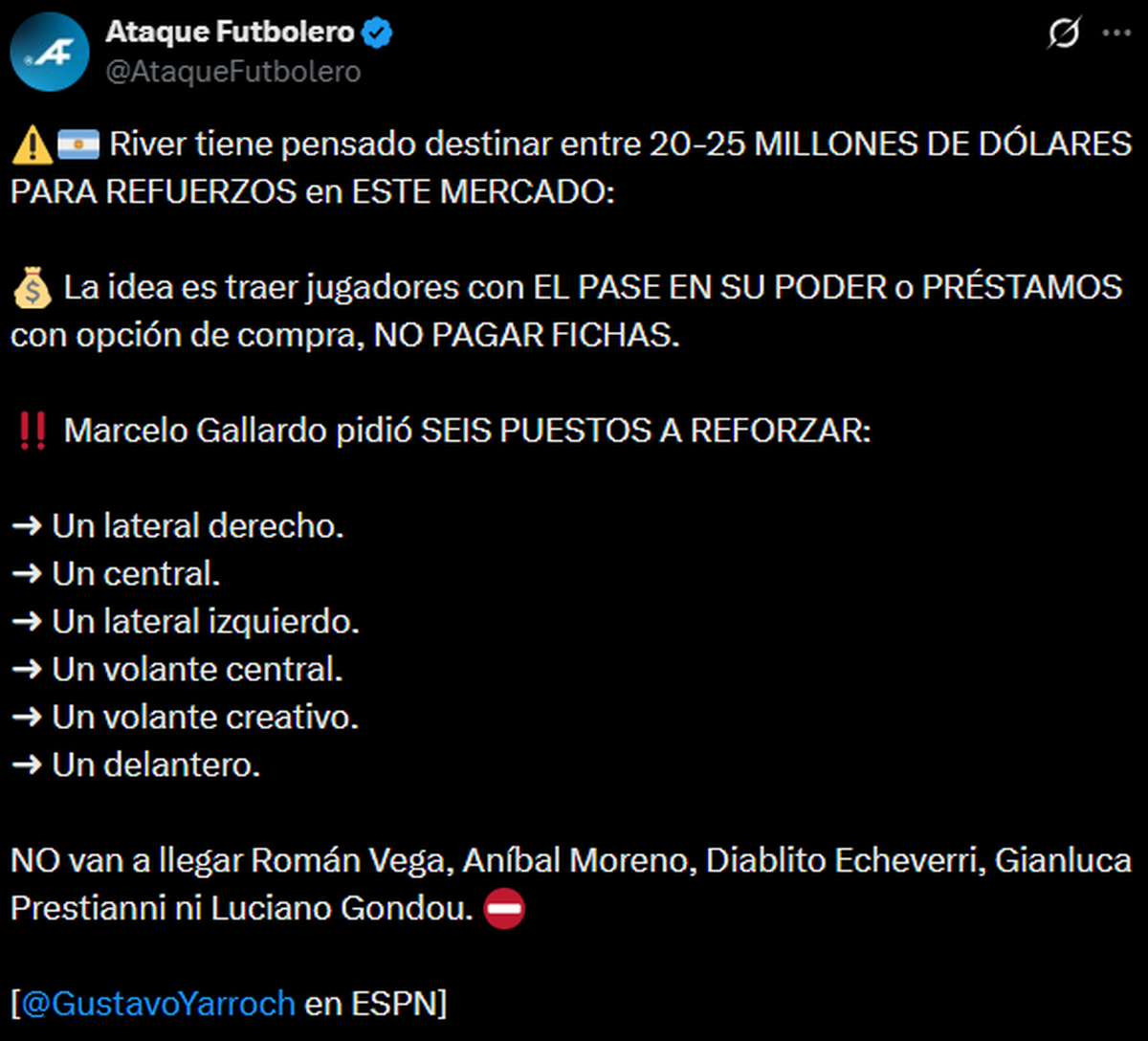 Al igual que ocurrió con la reciente limpieza del plantel —y con la posibilidad de que aún salgan más jugadores—, River también incorporará refuerzos en este mercado de pases pensando en la próxima temporada.