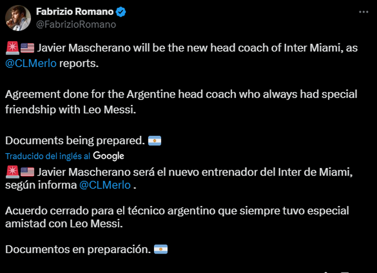 Mientras que Romano, posteó en su X: "Acuerdo cerrado para el técnico argentino que siempre tuvo especial amistad con Leo Messi. Documentos en preparación".