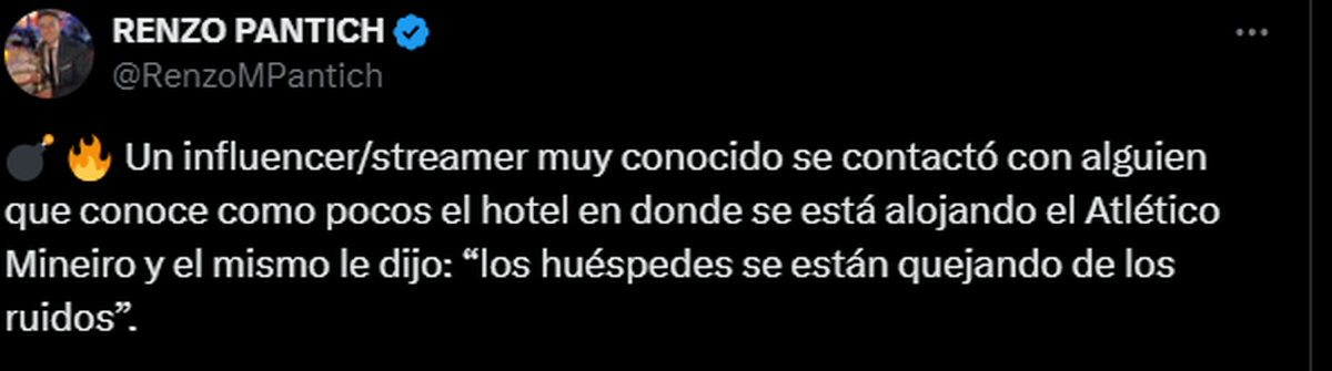 El periodista Renzo Pantich afirmó que: "un influencer/streamer muy conocido se contactó con alguien que conoce como pocos el hotel en donde se está alojando el Atlético Mineiro y el mismo le dijo: ´los huéspedes se están quejando de los ruidos´”.
